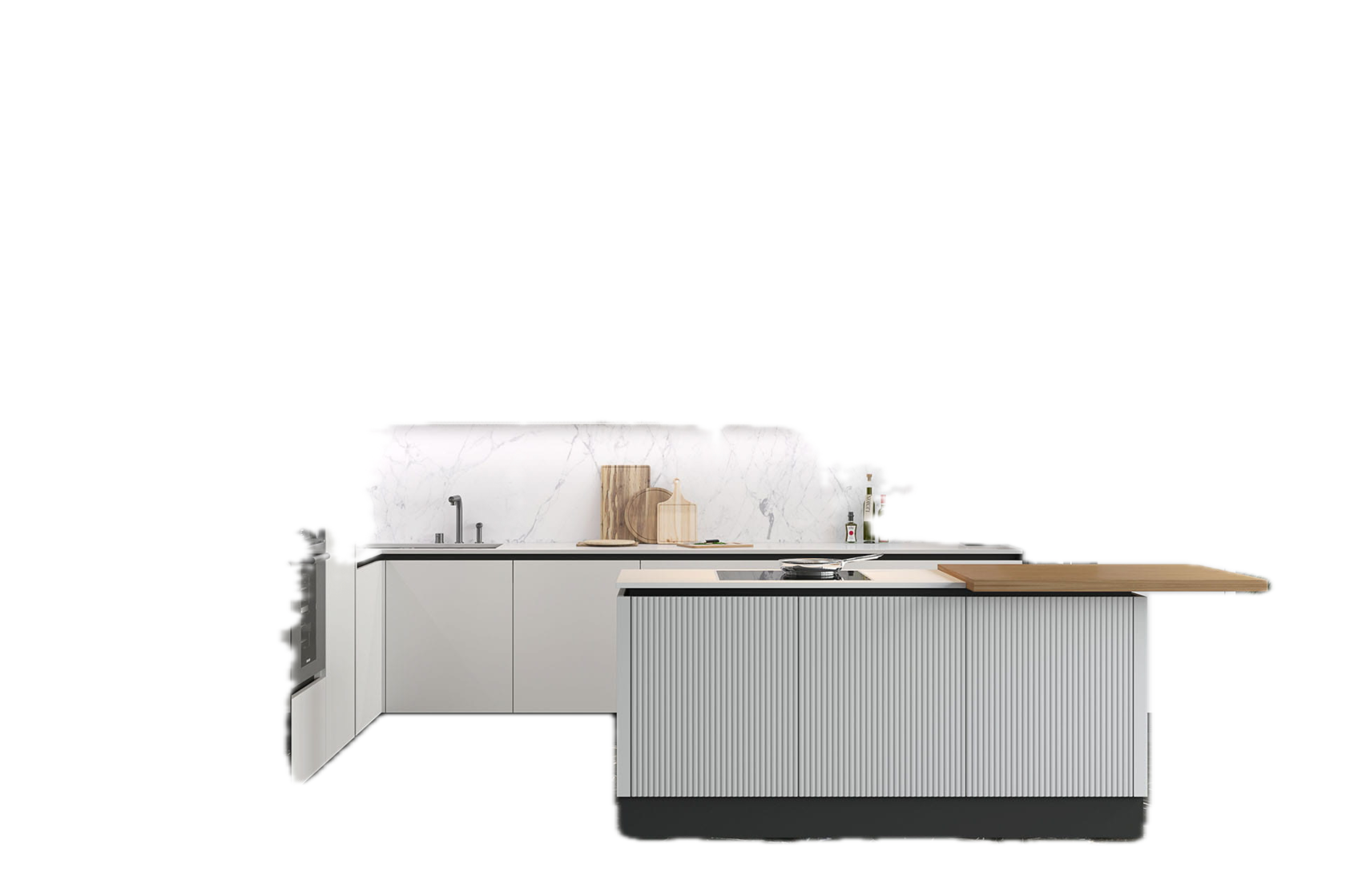 Итак, первый вариант - это кухня с фасадами в эмали, крашеными фасадами, столешницей из искусственного камня, классическими ручками и фурнитурой Blum во всем ее широком исполнении.